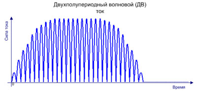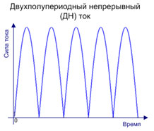 - Двухполупериодный непрерывный ток (ДН) состоит из непрерывно следующих друг за другом импульсов полусинусоидальной формы. Паузы между ними отсутствуют.